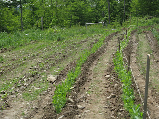 He had a large ball of twine and placed it in a small plastic bucket that had a handle. Then he put his belt through the handle before buckling it. Next he took the end of the twine and threaded it through a 18in long by 1/2 piece of PVC pipe, and tied the end off to the first stake. Then he walked back and forth between the rows, wrapping it around each stake he came to.Pea blossoms