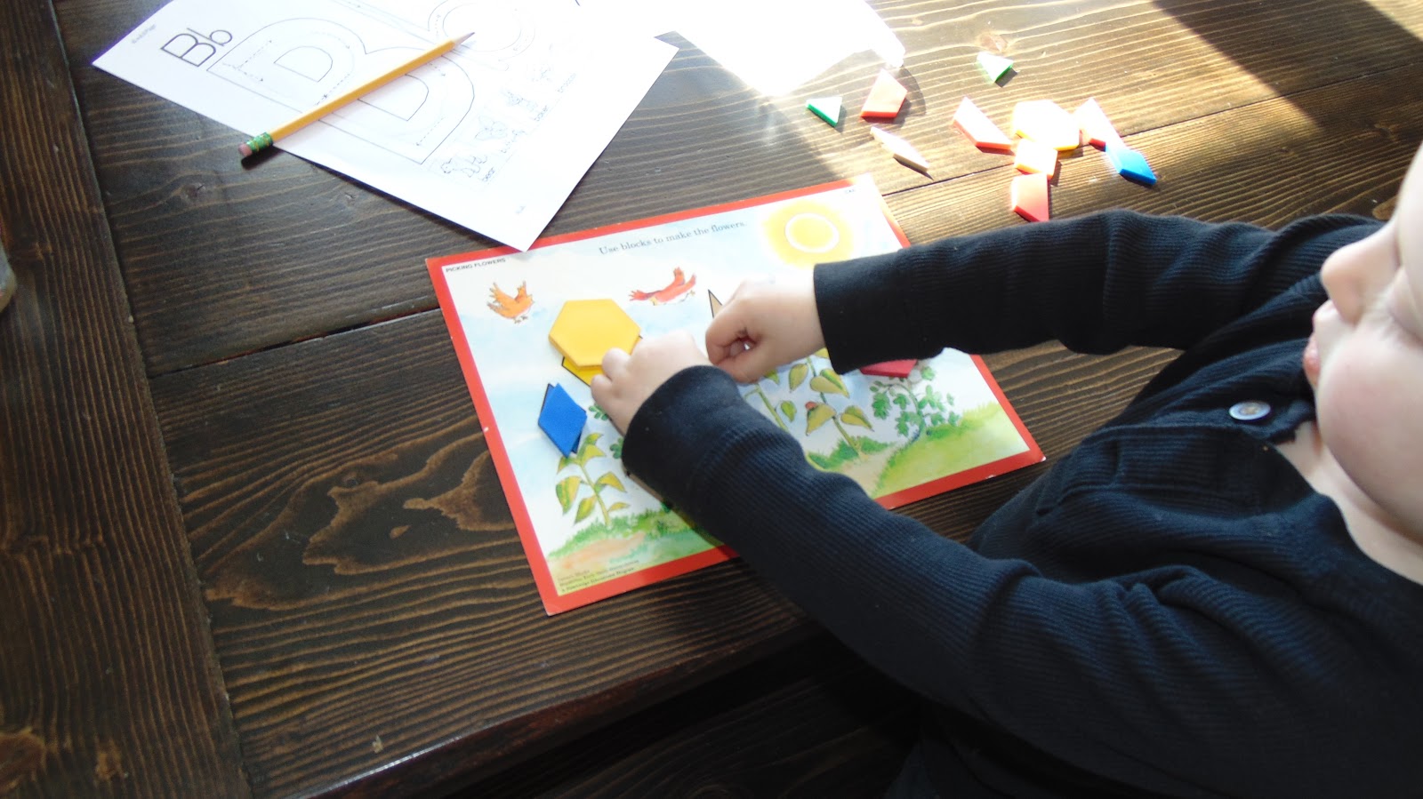 We also do Pattern Blocks. He likes matching up the blocks where they go, and learning the more "complicated" shapes.